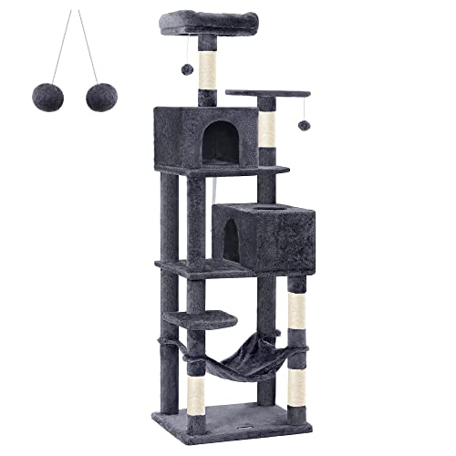 Feandrea Albero per Gatti Alto 191 cm, Tiragraffi per Gatti con 5 Pali Graffiatoi, 2 Posatoi, 2 Grotte, Amaca, 2 Pompon, in Peluche a Più Livelli, Grigio Fumo PCT191G01