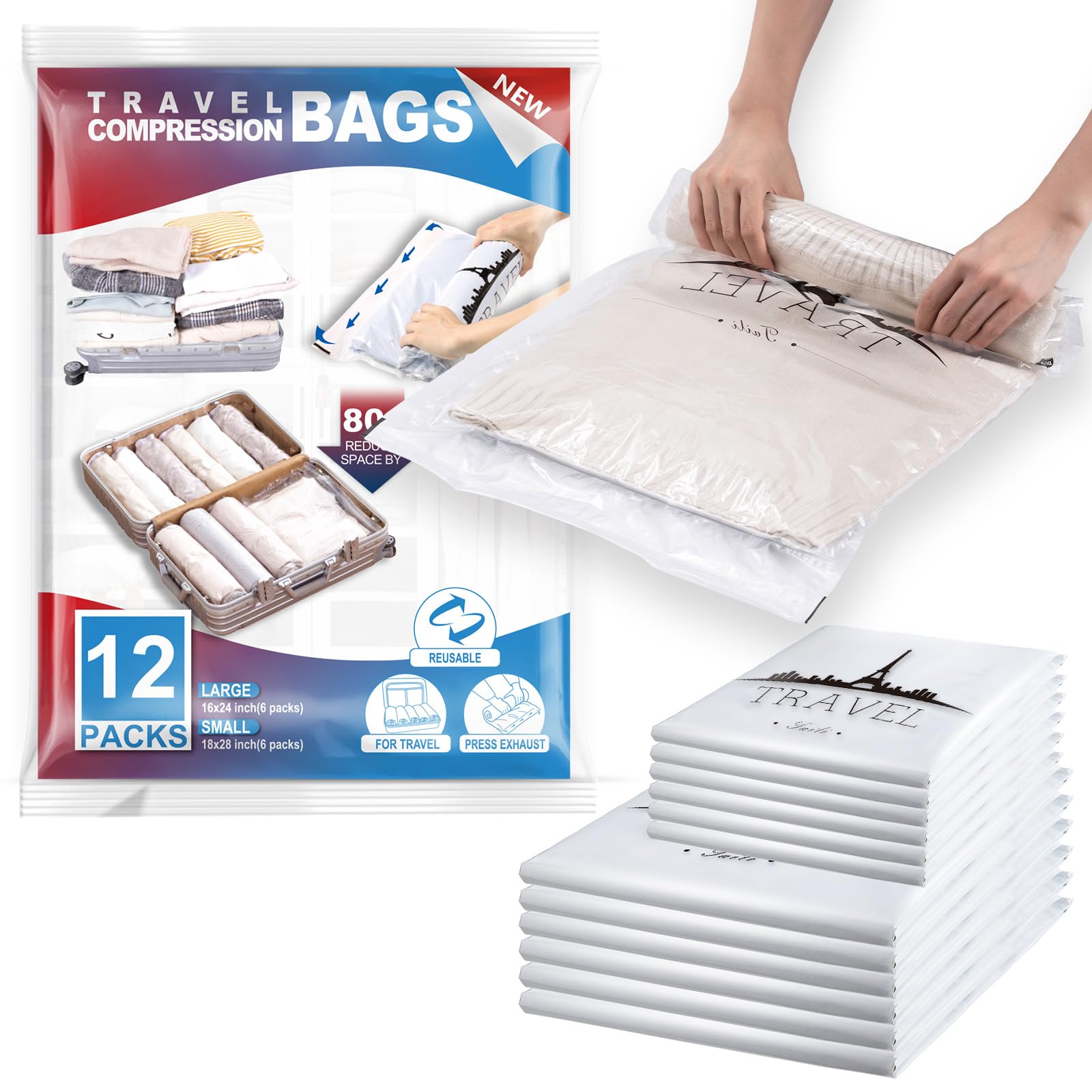 TAILI Sacchetti Sottovuoto Vestiti Viaggio 12 Pezzi 2 Taglie 70 x 45 CM, 60 x 40 CM Riutilizzabili Sacchetti Sottovuoto per Viaggio, Valigia, Zaino, Senza Pompa Necessaria Sacchetti Vestiti Viaggio