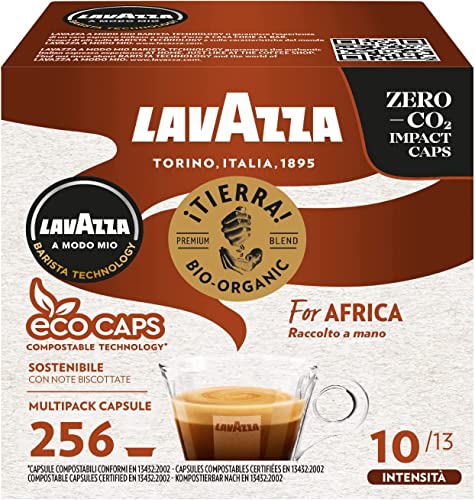 Lavazza A Modo Mio Tierra for Africa, 256 Capsule Compostabili Caffè, per un Espresso con Note Biscottate, 100% Arabica, Intensità 10/13, Tostatura Leggera, 16 Confezioni x 16 Capsule